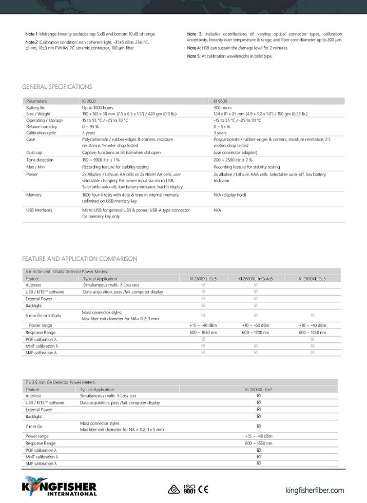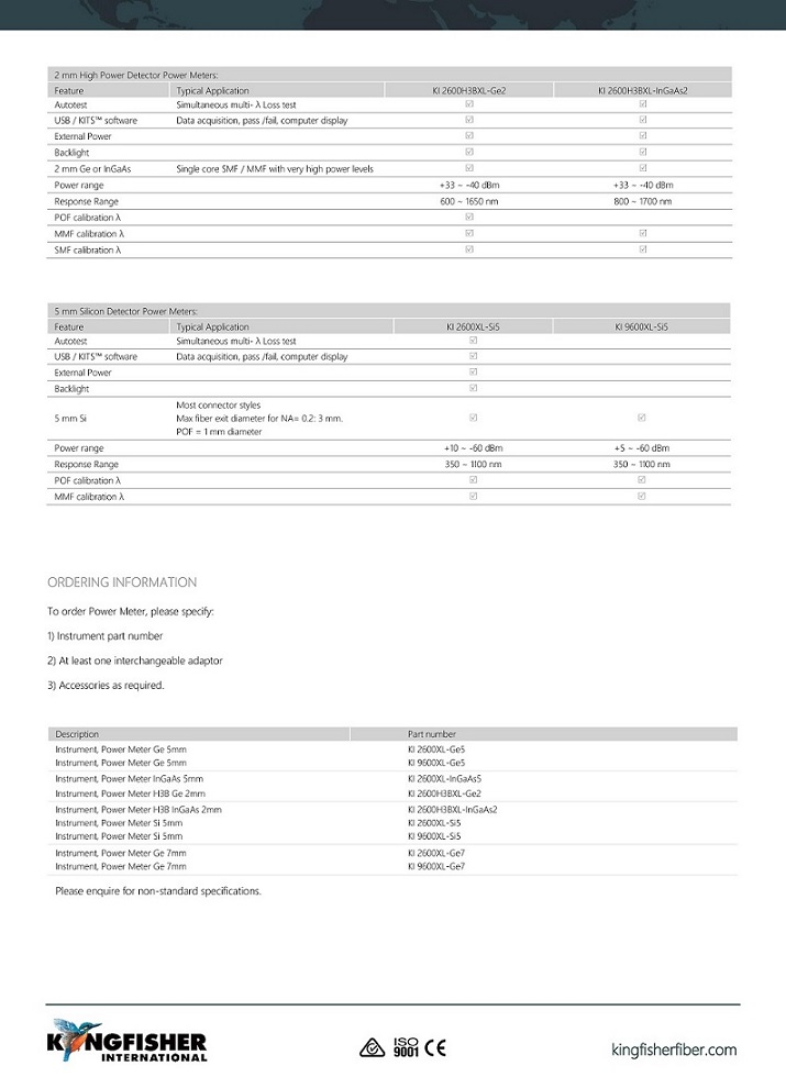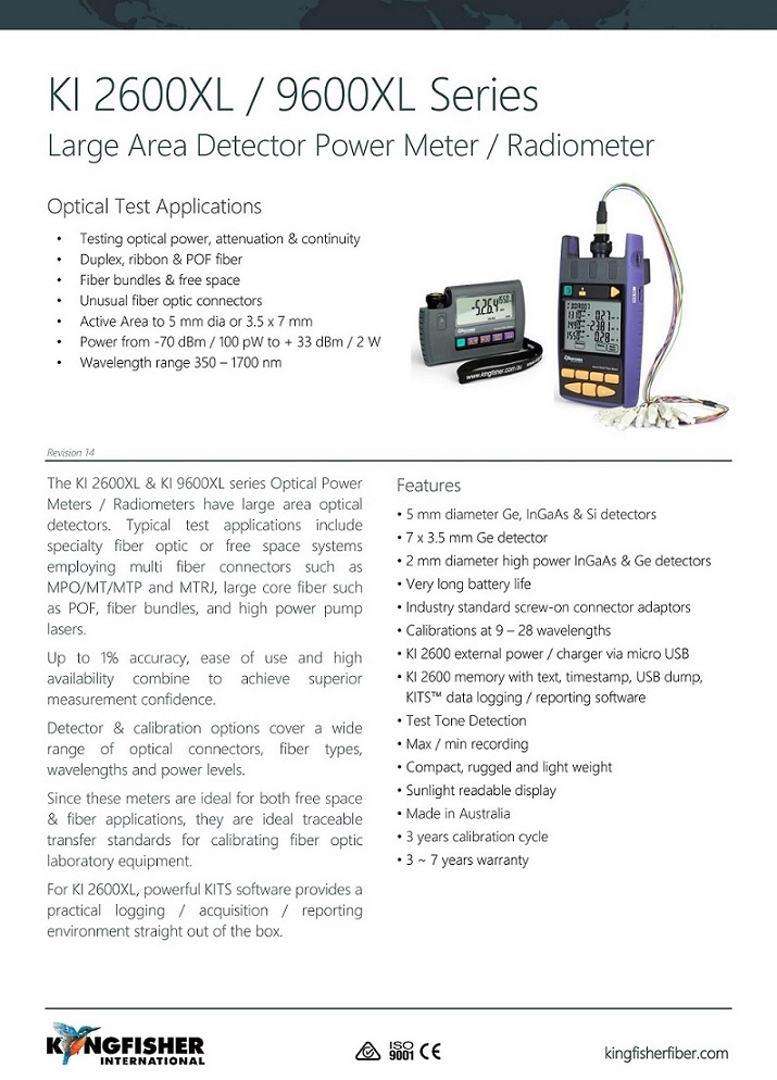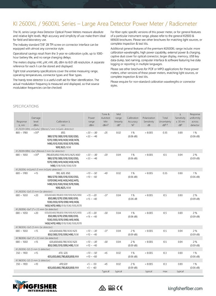 KI 9600XL-Ge7和功能豐富的KI 2600XL-Ge7光功率計提供了一系列優點,包括易用性,高精度和提高的生產率,而KI2600XL-Ge7包括出色的報告軟件。